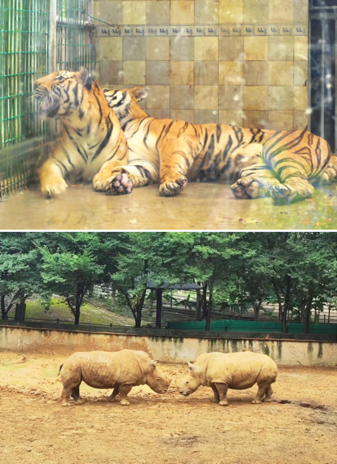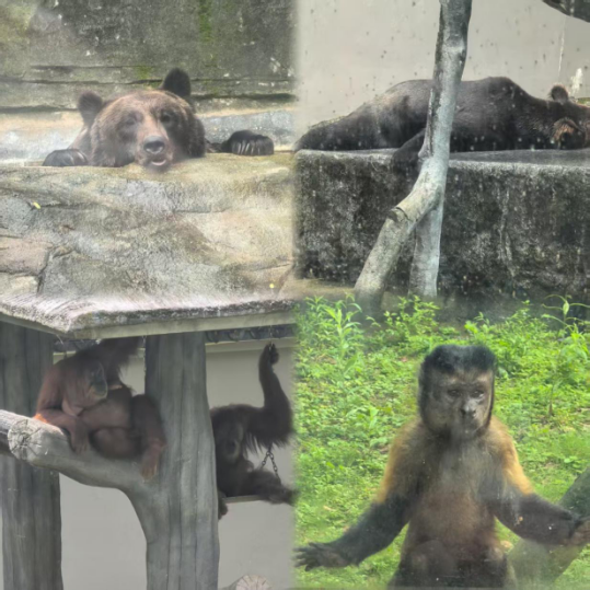 在老虎園區(qū)里,威風(fēng)凜凜的白虎和東北虎隔著籠子互相打量,時而發(fā)出低沉的吼聲交流,而另一邊的兩頭東北虎則親密地緊挨在一起打盹,斑駁的樹影灑在它們金黃的皮毛上。不遠(yuǎn)處的犀牛區(qū),兩只體型龐大的白犀牛正在上演領(lǐng)地之爭,它們用粗壯的角互相頂撞,揚(yáng)起陣陣塵土,發(fā)出沉重的鼻息聲;非洲大羚羊區(qū)最是熱鬧,高大的羚羊們溫順地低下頭,伸著脖子吃著小朋友親手投喂的食物,長長的睫毛在陽光下忽閃忽閃。樹冠間,靈巧的長臂猿扒著樹干蕩著秋千,偶爾還會停下來好奇地觀察下方拍照的游客。園區(qū)主干道上,飼養(yǎng)員牽著一匹可愛的袖珍小馬漫步,珍珠馬的脖子上系著的鈴鐺隨著步伐發(fā)出清脆的聲響。整個園區(qū)洋溢著人與動物和諧相處的氛圍。